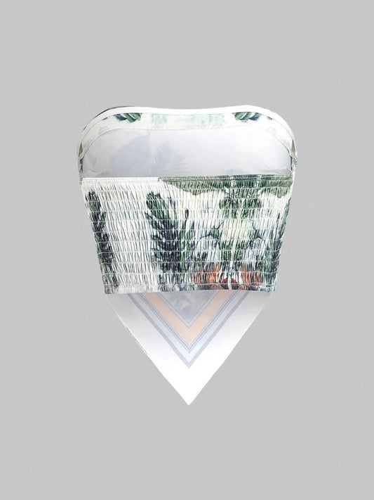 Tropical Leaf Print Smocked Tube Top